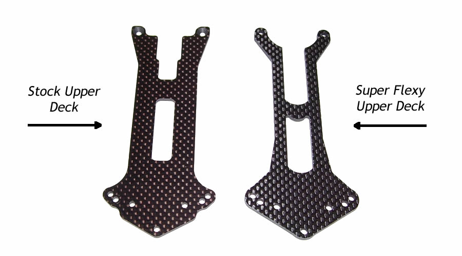 Tweak your ride."Super Flexy" Rear Upper Deck. Allows for more twist to make more traction on low bite, rough, bumpy and rutted tracks. Works better than stock on most any track.