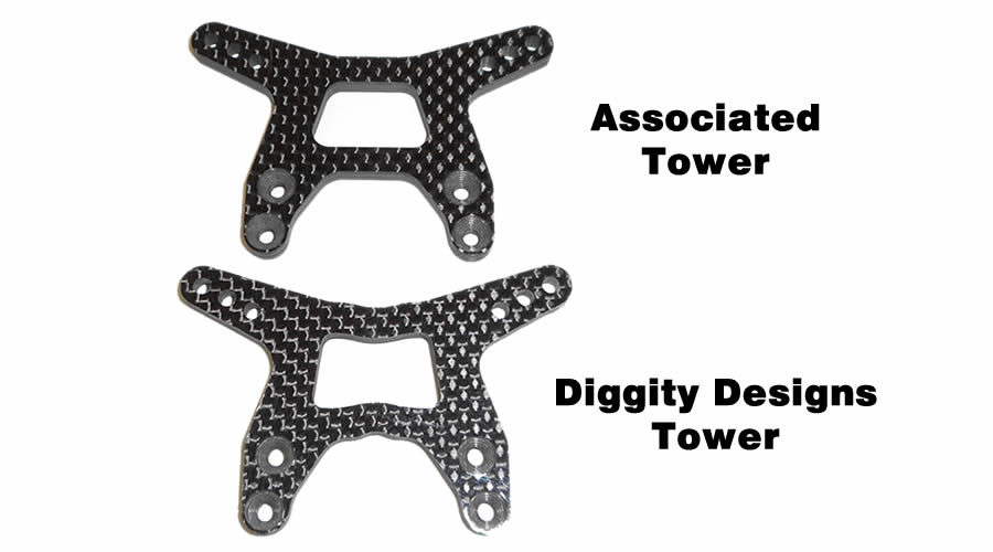 B6 4mm Gull Wing style carbon fibre front shock tower upgrade. Strong and Stylish. Cut from well known Diggity Designs high quality US sourced quasi carbon fibre.