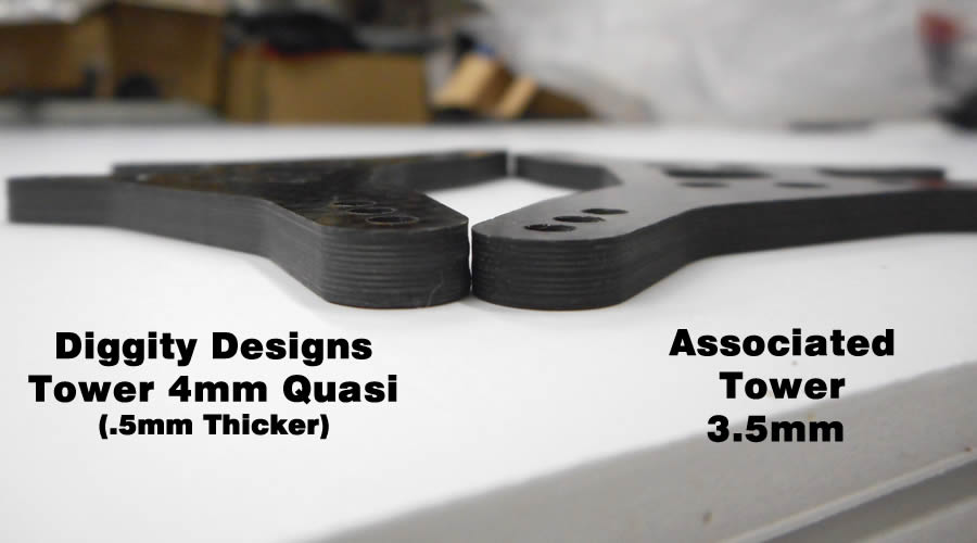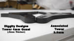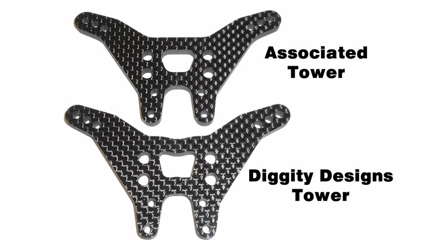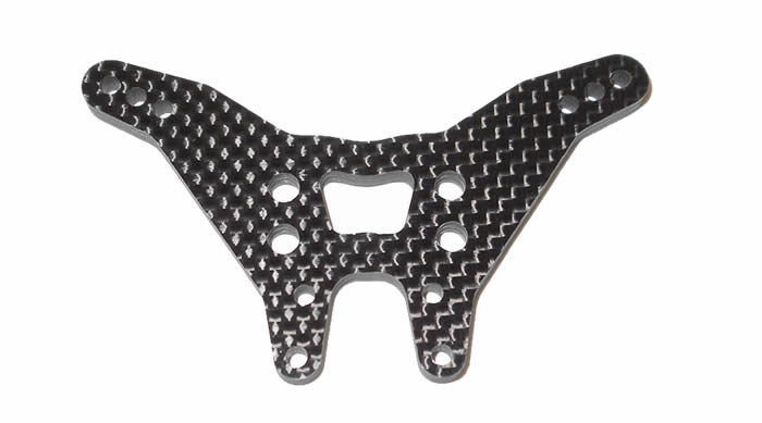 B6 4mm Long style carbon fibre rear shock tower upgrade. Strong, Rigid and Stylish. Cut from well known Diggity Designs high quality US sourced quasi carbon fibre. (.5mm thicker than stock tower)