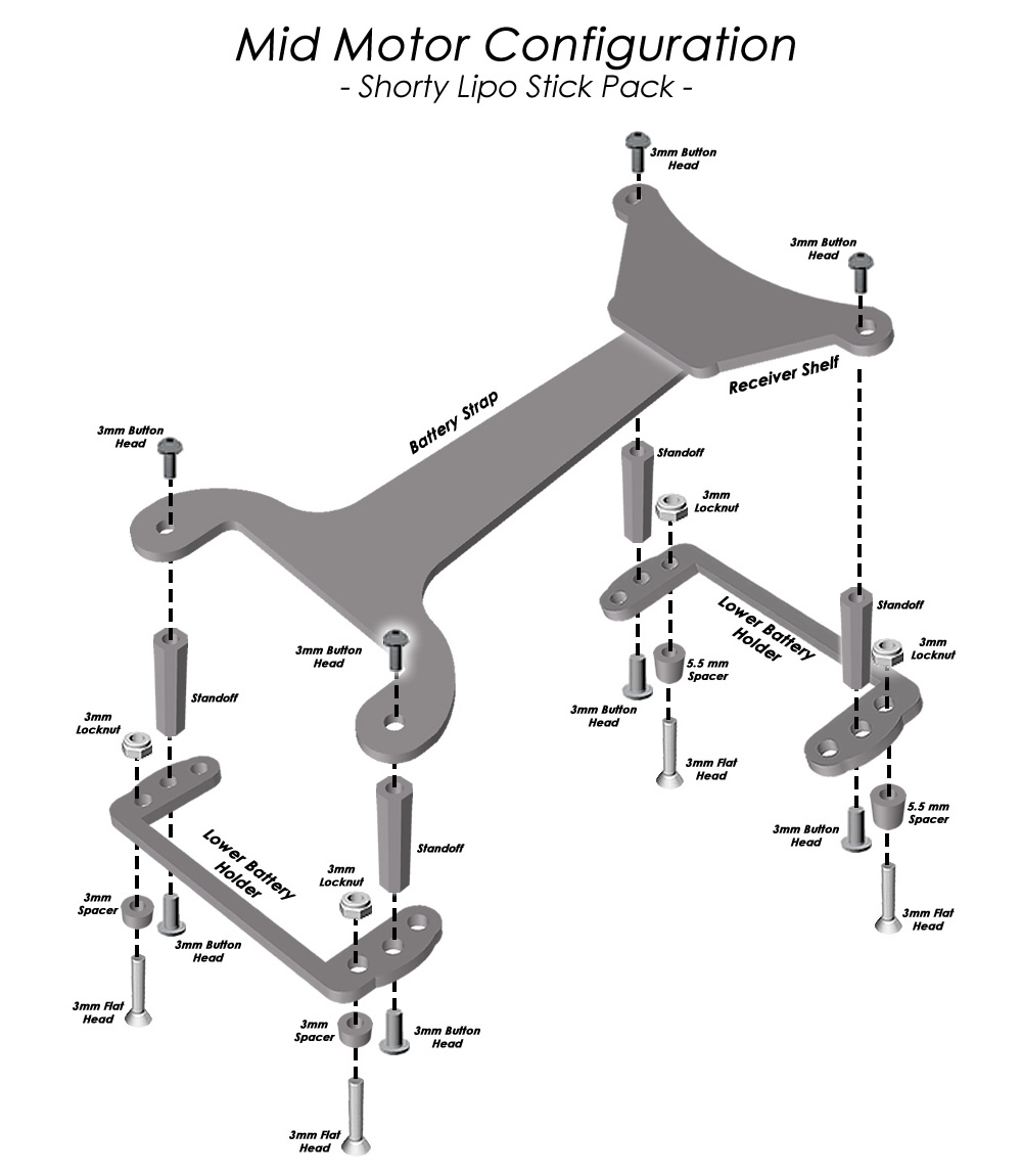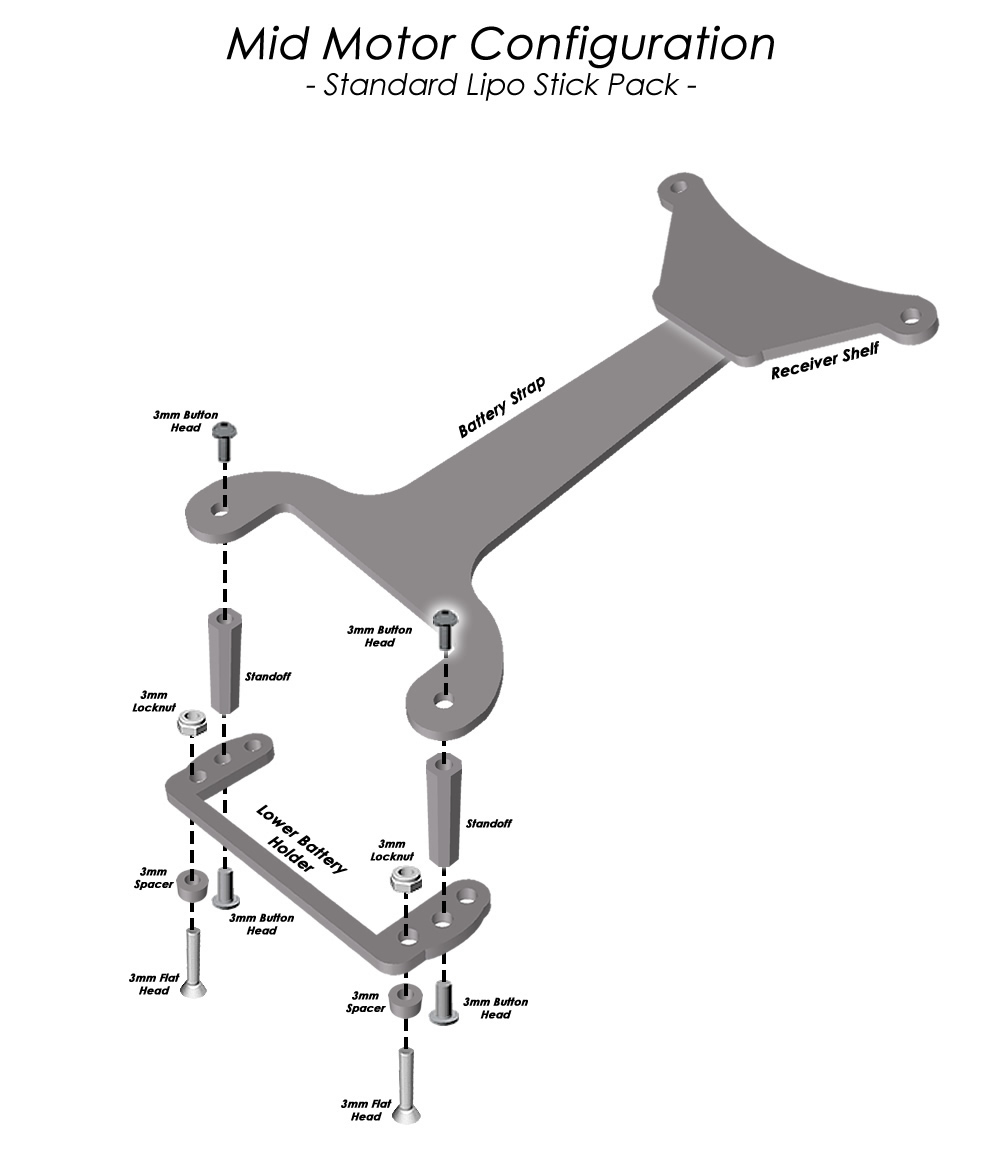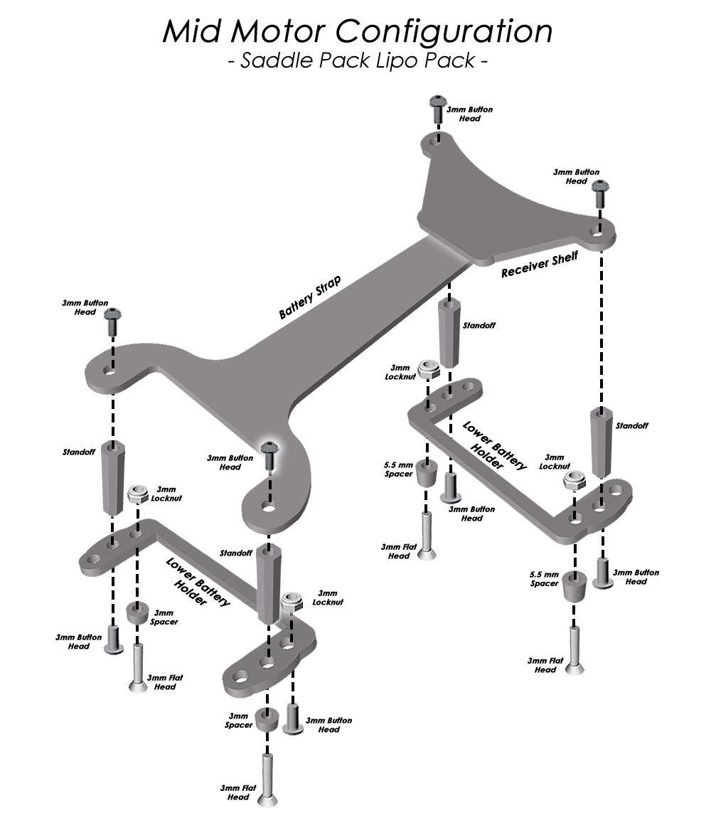 RT6 battery strap set upgrade. Includes battery strap, battery strap holder/receiver mount, front and rear lipo braces and hardware. If you are going to use Kyosho thumb screws please select thumb screw option below.